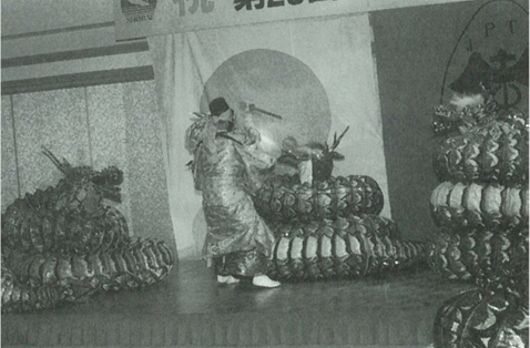 懇親会での石見神楽。大蛇が火を噴きながら舞っています。モノクロのため迫力が伝わらないのが残念です。