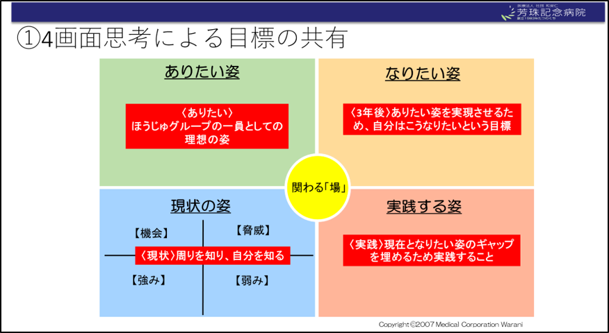 キーワード:4画面思考、院内キャンパス、グループ連携による地域と病院の経験